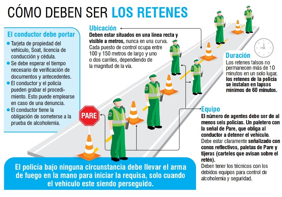 Hay un reglamento de cómo deben ser los retenes, y entre los aspectos más importantes están: debe haber por lo menos seis policías claramente identificados con conos reflectivos y chalecos amarillos que digan Policía de Tránsito, y estar situados en una vía recta, nunca en curva.