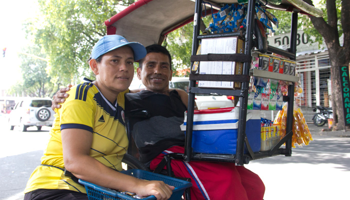 Jairo Ardila se ubica todos los días de 7:30 de la mañana a 5 de la tarde, con su esposa, en la avenida 1 con Diagonal Santander. Allí vende dulces, pipas, agua, galletas, entre otros productos, y les va muy bien, aunque quisieran que todo fuera mejor, pues no tienen casa y pagan un arriendo en Los Olivos, Atalaya, bastante costoso.