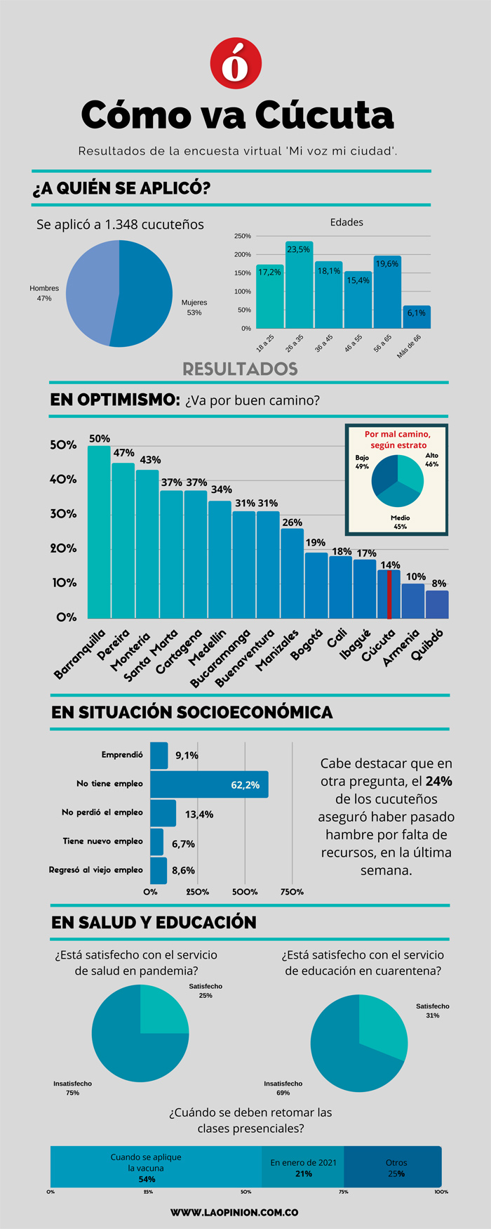 “Lo anterior es entendible dado el contexto de la pandemia y sus efectos en términos económicos y sociales, como se puede evidenciar en otras preguntas”, según Mario Zambrano, director del programa Cúcuta Cómo Vamos, en el que fungen como socios estratégicos el diario La Opinión, la Universidad Libre y la Cámara de Comercio.