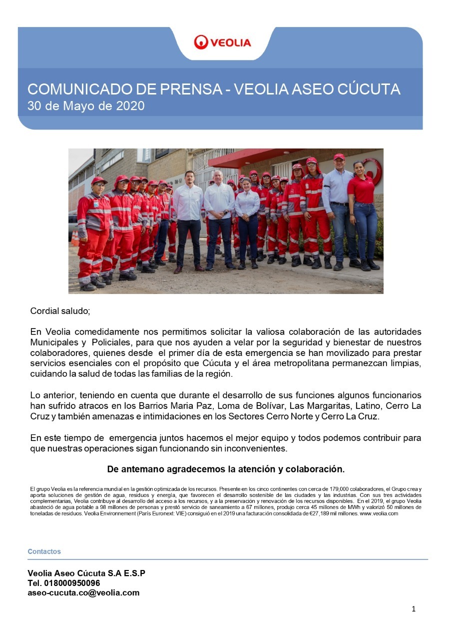 “Nos permitimos solicitar la valiosa colaboración de las autoridades municipales y policiales, para que nos ayuden a velar por la seguridad y bienestar de nuestros colaboradores, quienes desde el primer día de esta emergencia -por la COVID-19- se han movilizado para prestar servicios esenciales”, señaló Veolia.