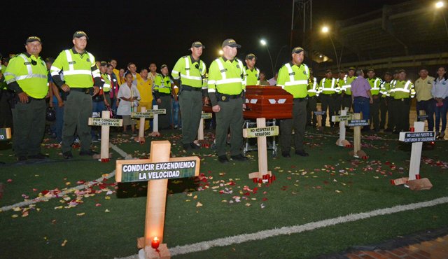 En medio del escenario de recordación, que transmitía un mensaje de prevención, los uniformados encendieron velones y caminaron llevando en sus manos un ataúd que representaba la víctima número 84 de 2016.