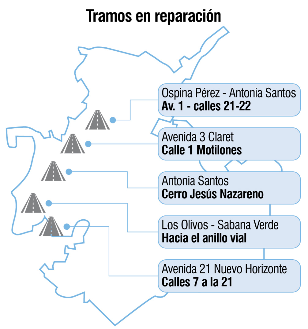 Los Olivos-Sabana Verde también figura dentro de los proyectos del DPS. Contreras dijo que son cerca de 400 metros los que se pavimentará hasta conectar con el anillo vial en su paso por el occidente. Los vecinos del sector habían reclamado la obra ante la negativa del transporte público a transitar por allí por el mal estado de la vía.
