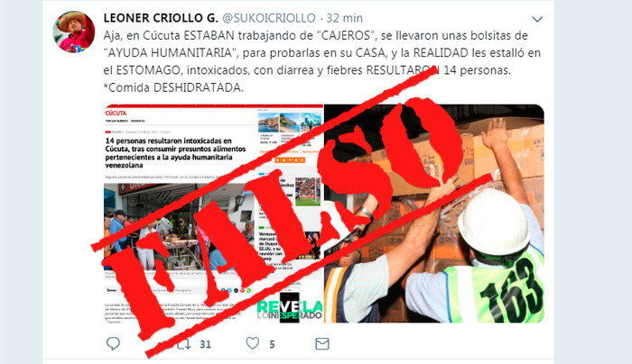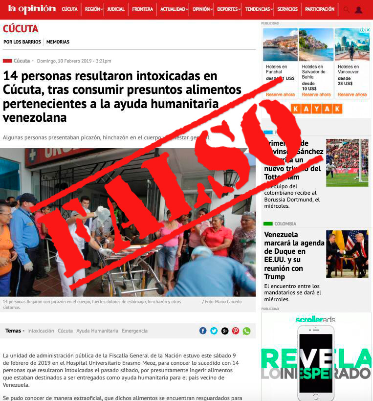 En la foto se aprecia una FALSA información supuestamente publicada por La Opinión, en la que se dice que 14 personas resultaron intoxicadas por consumir alimentos de la ayuda que llegó en días pasados a Cúcuta.