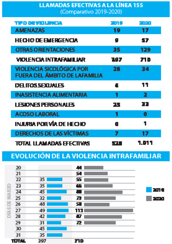 De acuerdo con un informe de la Vicepresidencia de la República y la Consejería Presidencial para la Equidad de la Mujer (CPEM), de 397 llamadas que se recibieron en 2019, entre el 22 y el 31 de marzo, para denunciar presuntos casos de violencia intrafamiliar, este año la cifra se elevó a 710, en el mismo periodo de tiempo.