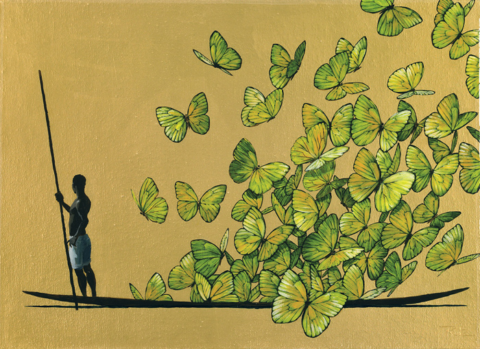 Viajeras amarillas, serigrafía sobre hojilla de oro. Imagen de julio.
