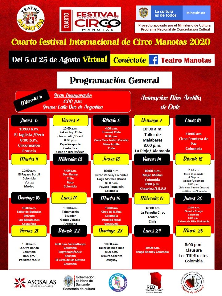 La Corporación Cultural Teatro Manotas con sede en la Ciudad de Cúcuta, organiza el Cuarto festival Internacional de Circo manotas 2020 Virtual, que se realiza del 5 al 25 de agosto, con la participación de 40 agrupaciones de más de 15 países como: Alemania, Francia, E.E.U.U, Argentina, Perú, Ecuador; Brasil, Costa Rica, Guatemala, Venezuela, México, Chile, Uruguay y Colombia.