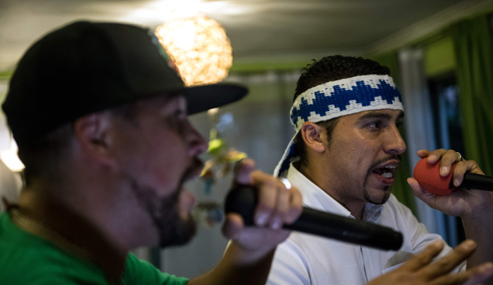 Con la cabeza rodeada por la tradicional bandana de colores ‘Trarilonco’, tres miembros del grupo escupen su flujo rítmico, mientras cada uno sacude un "wada", una forma de maracas tradicionales de la cultura mapuche.