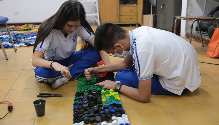 Los estudiantes emplearon 20.000 tapas de gaseosa de todos los colores.