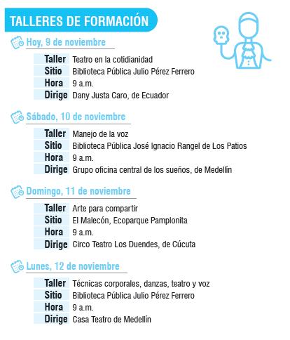 Todas las funciones son gratuitas y para el ingreso al auditorio Eduardo Cote Lamus de la Torre del Reloj, al Teatro Municipal y a Casa Teatro, se recogerá un aporte voluntario. Así mismo, la Fiesta ofrece talleres de formación sin costo alguno.