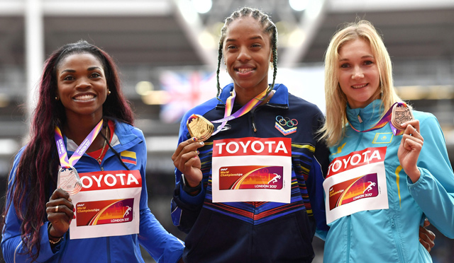 Nueve años después, su nombre ha tomado vuelo como sus saltos. Este lunes, a sus 33 años y pese a ceder el reinado del salto triple mundial en Londres, en el cual estaba desde hacía cuatro años, el semblante de la paisa estaba intacto.