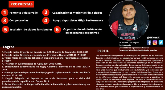 El IMRD resaltó el perfil profesional del rugbista, quien es presidente del club Cobras, es el tercer mejor entrenador del país en el ranking de la Federación Colombiana de Rugby, es tricampeón sudamericano de rugby en los años 2014-2015-2016 y gestor de convenios de cooperación con Cancillería de Colombia y entes gubernamentales y no gubernamentales, entre otros logros.