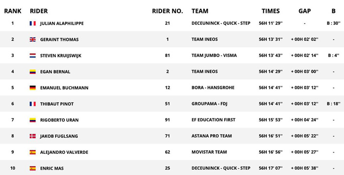 En el Día Nacional de Colombia sí cumplió con las expectativas el compañero de Thomas en el Ineos, Egan Bernal, que recuperó el maillot blanco que Mas le arrebató en la crono del viernes. Entró quinto por detrás del alemán Emanuel Buchmann y cedió 8 segundos con Pinot. A continuación entró el español Mikel Landa.