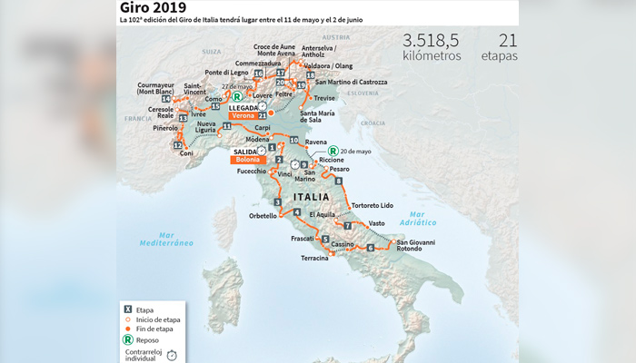El Giro de Italia de 2019 presentó este miércoles en Milán su recorrido de la edición 102, con siete llegadas en alto, tres contrarreloj y el vigente campeón, Chris Froome, admitiendo que no está seguro de si participará en la carrera, que arranca el 11 de mayo en Bolonia y finaliza el 2 de junio en Verona.