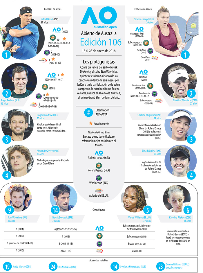 Además del pulso entre las dos leyendas, que solo se podrán enfrentar en la final, en Australia intentará regresar al máximo nivel el serbio Novak Djokovic, tras no jugar durante la segunda mitad de 2017 por una lesión en el codo.