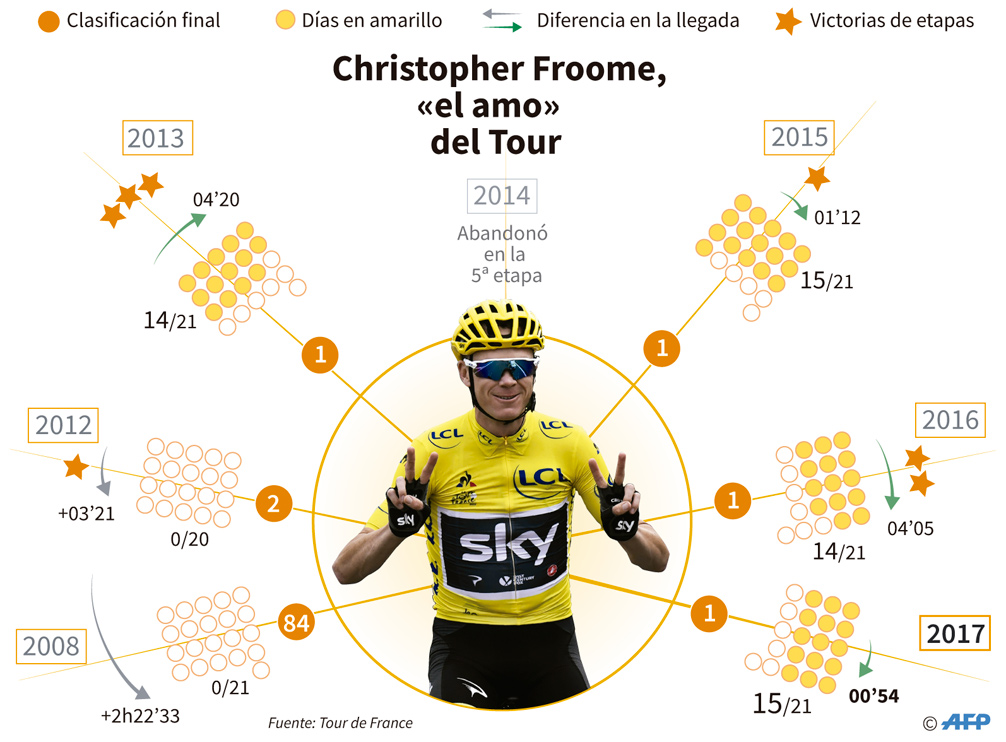 "Me siento un privilegiado de estar en una posición donde puedo intentar alcanzar a campeones como Anquetil, Merckx, Hinault e Indurain", que lograron cinco triunfos cada uno, añadió "Froomey", que solo dejó escapar el triunfo una sola vez desde 2013, cuando se cayó y tuvo que abandonar en 2014.