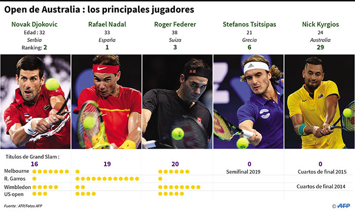 Rafael Nadal (1 en la ATP) puede igualar en el Abierto de Australia los 20 grandes de Roger Federer (3), en una batalla por la eternidad que completa Novak Djokovic (2) y que se disputará desde hoy en Melbourne, amenazada por el humo tóxico provocado por los incendios.
