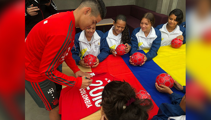 Durante el encuentro en la sede del club alemán, el astro colombiano saludó a las deportistas, las invitó a seguir por el camino del deporte y recalcó la importancia de la constancia y la disciplina para alcanzar las metas. Las niñas vieron al futbolista jugar el primer partido de la Bundesliga en el estadio Allianz Arena de Múnich.