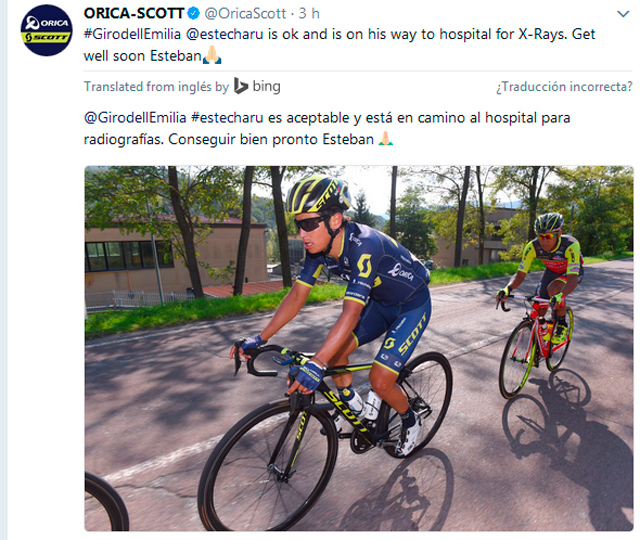 El ciclista colombiano Esteban Chaves, del equipo Orica-Scott, sufrió este sábado una dura caída durante el Giro de la Emilia, disputado entre las ciudades italianas de Bolonia y San Luca sobre 223,3 kilómetros.