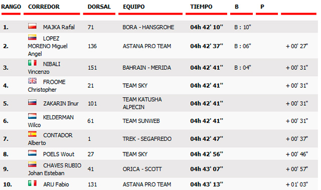 Majka, último superviviente de la escapada del día, se impuso en solitario por delante del colombiano Miguel Ángel López (Astana), segundo a 27 segundos, y del italiano Vincenzo Nibali (Bahrain), tercero a 31 segundos, dando paso a Froome, cuarto.