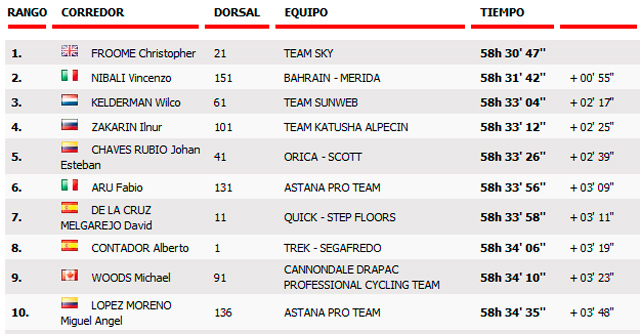 El italiano sigue segundo en la general a 55 segundos del británico, mientras el colombiano Esteban Chaves (Orica), que había empezado la jornada en tercera posición, cayó a la quinta a 2 minutos 39 segundos, tras sufrir en la subida a la meta.