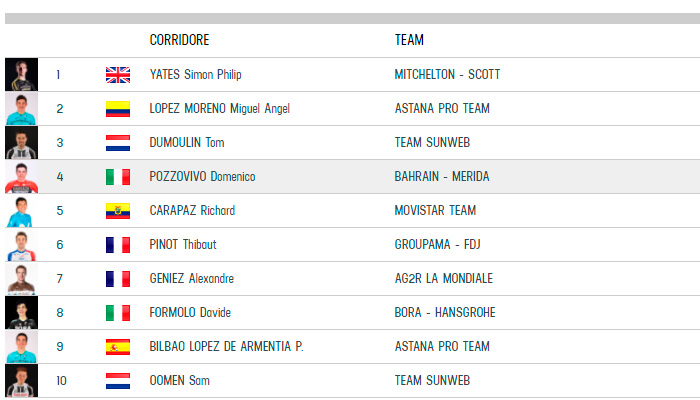 El colombiano mantuvo una dura lucha con Tom Dumoulin, Domenico Pozzovivo, Richard Carapaz y Thibaut Pinot, todos a 41 segundos del ganador, Yates, compañero del bogotano Esteban Chaves, quien se mantiene como líder de la general.