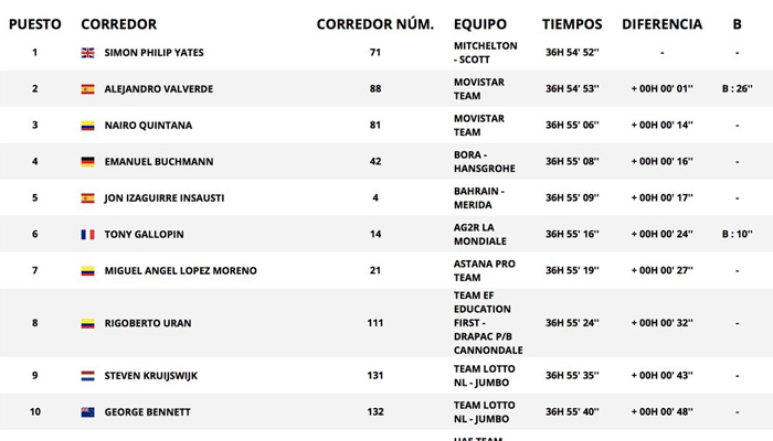 En la víspera de la primera jornada de descanso de la carrera, Yates aventaja en un segundo a Valverde, en 14 a Quintana, en 16 al alemán Emanuel Buchmann, en 27 a 'Supermán' López y en 32 a Urán, por citar a los principales aspirantes al podio.