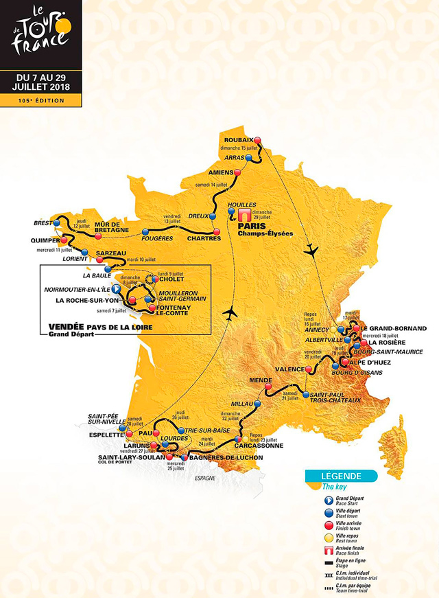 Como en 2015, cuando el Tour salió de Utrecht (Holanda), la primera parte, de nueve etapas, será sobre todo llana, en la región oeste de Francia. Con algunos atractivos, como la contrarreloj por equipos del tercer día en Cholet y dos etapas accidentadas en Bretaña, con llegadas en Quimper y Muro de Bretaña.