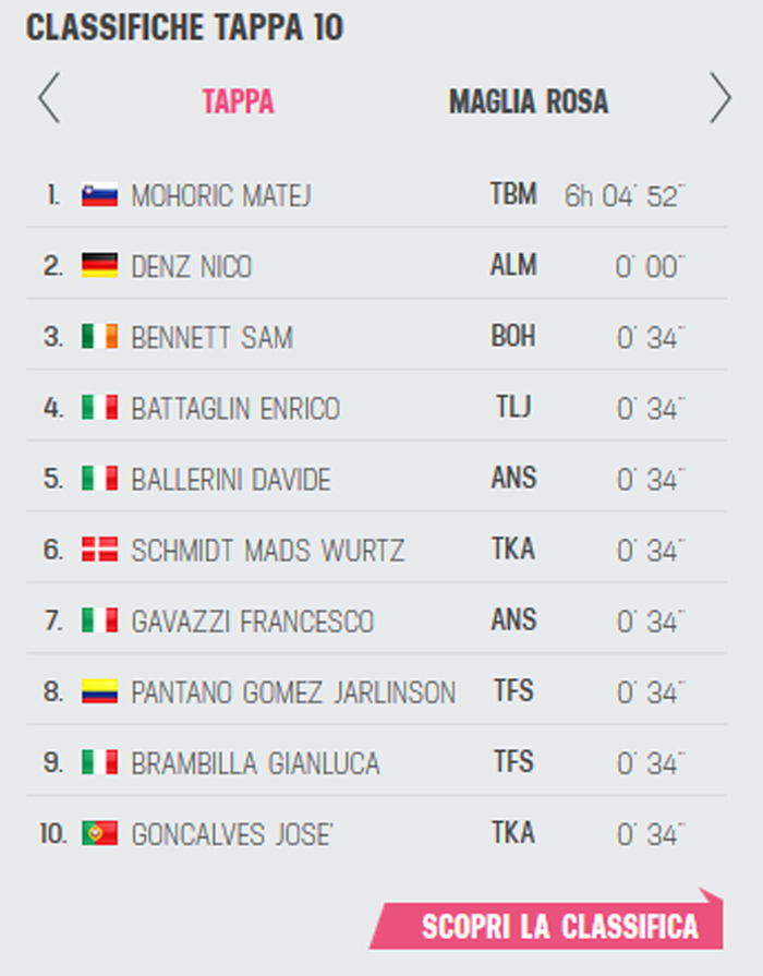 El ciclista esloveno Matej Mohoric (Bahrein) se impuso en la 10ª etapa del Giro de Italia, este martes con final en Gualdo Tadino, en la que el colombiano Esteban Chaves, segundo en la general, perdió mucho tiempo.