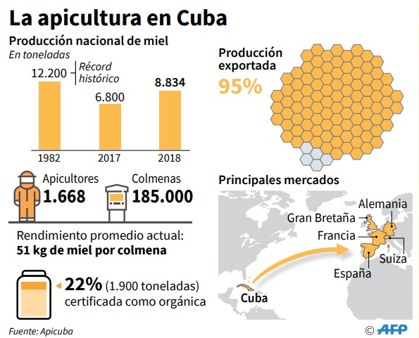 En 2018, Cuba produjo 8.834 toneladas de miel, 1.300 toneladas por encima del plan previsto por la estatal Empresa Apícola Cubana (Apicuba, rectora), una cantidad pequeña si se compara con Argentina, el mayor productor de la región, que superó las 76.000 toneladas en 2017, según la FAO.