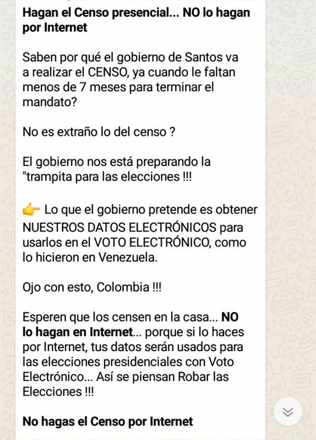 "Es falsa la información que circula por redes, según la cual el censo poblacional se utilizará para hacer fraude en las elecciones del 2018. Primero, porque nada tiene que ver el censo poblacional con los procesos electorales y, segundo, porque aquí en Colombia votamos físicamente y presencial y no por medio de internet".