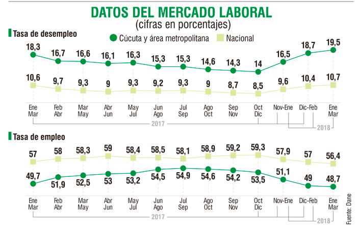 Los primeros tres meses de 2018 no marcaron ninguna mejora en materia de empleo para Cúcuta. Por el contrario, la crisis se acentuó aún más y la tasa de desocupación cerró en 19,5%, la más alta del país y también la mayor para la ciudad desde el periodo enero-marzo de 2014, cuando el resultado fue el mismo.
