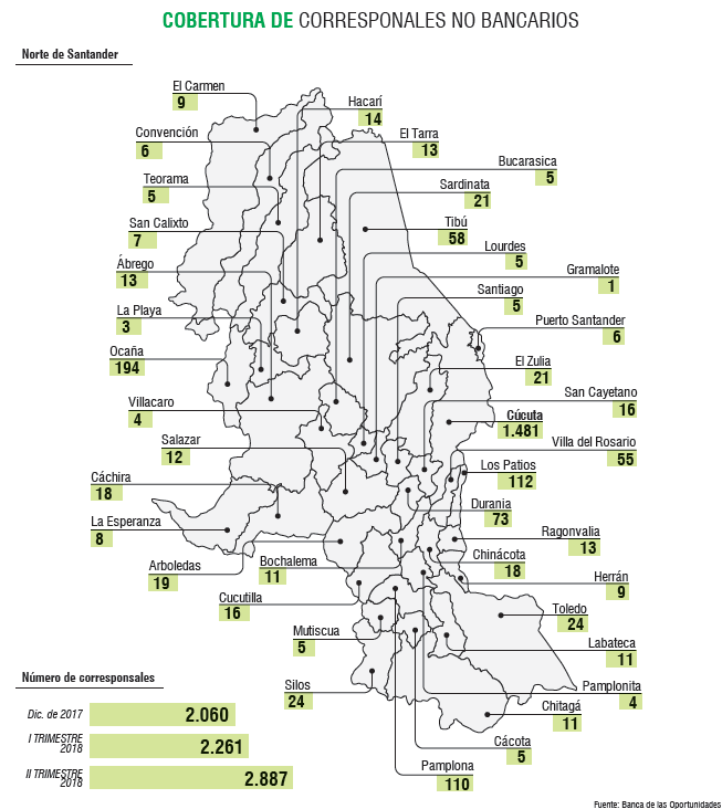 La entidad reveló que Norte de Santander pasó de tener 2.060 corresponsales en diciembre de 2017 a 2.887 en el segundo trimestre de 2018, es decir, un aumento de 40%.