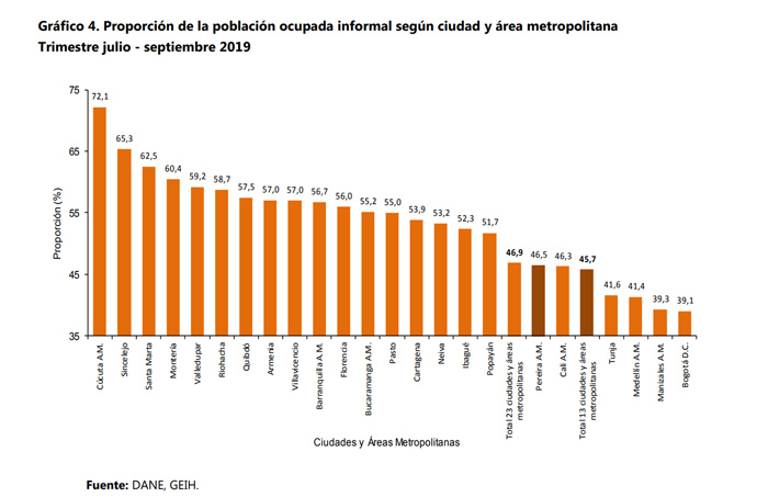 Cúcuta fue la ciudad con mayor tasa de informalidad al registrar 72,1 %. A esta le siguió Sincelejo, con 65 % y Santa Marta, con 62,5 %. En contraste con esto, las ciudades con menor proporción de informalidad fueron Bogotá, con 39,1 %, Manizales, con 39,3 % y Medellín en su área metropolitana, con 41,4 %.