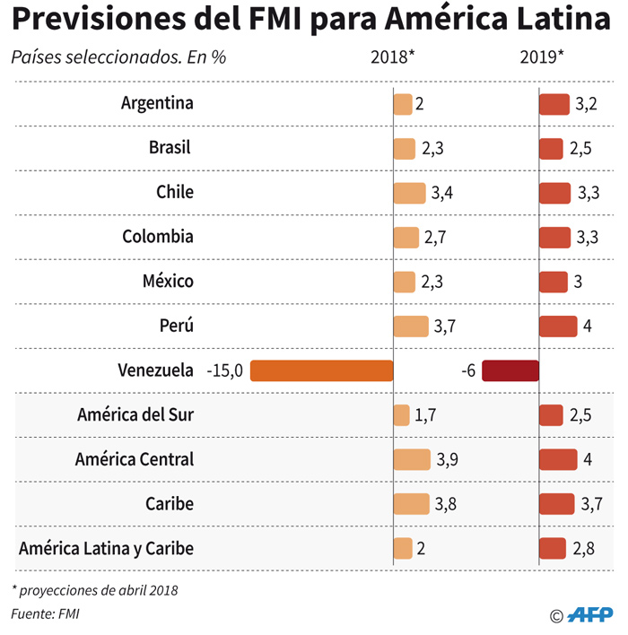 La región crecerá 2,0% en 2018 y 2,8% en 2019, tras un incremento del 1,3% de 2017, señaló el FMI en su Panorama Económico Mundial de abril, en el que confirmó la caída de 15% del Producto Interno Bruto (PIB) de Venezuela anticipada en enero.
