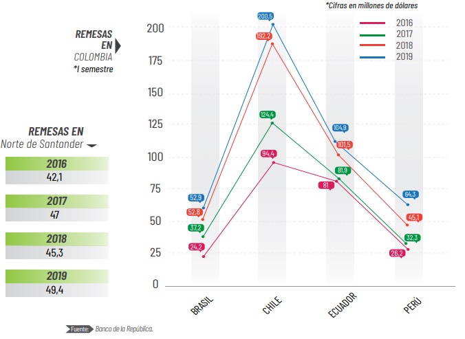 Según el reporte del Banco de la República, en el último semestre del año la llegada de remesas creció, en el 2018 llegaron 52 millones de dólares. Gran parte de este dinero se invierte en la compra de bienes en Cúcuta por parte de los migrantes.