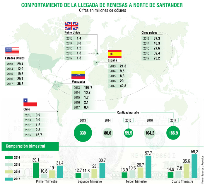 A Norte de Santander ingresaron 186,7 millones de dólares en 2017 por concepto de remesas, cerca de 520.000 millones pesos. La cifra es la más alta desde 2013, último año en que las remesas venezolanas se presentaban como un gran negocio.