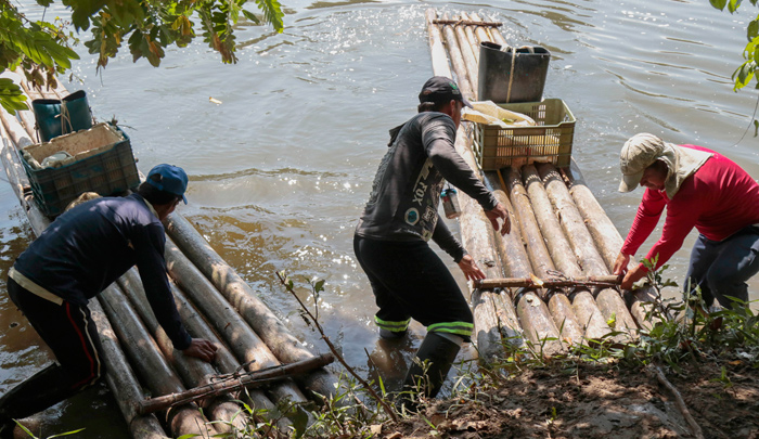En la orilla del río Pamplonita los esperan dos balsas; antes de echarlas al agua, se aseguran de subir su material de trabajo.