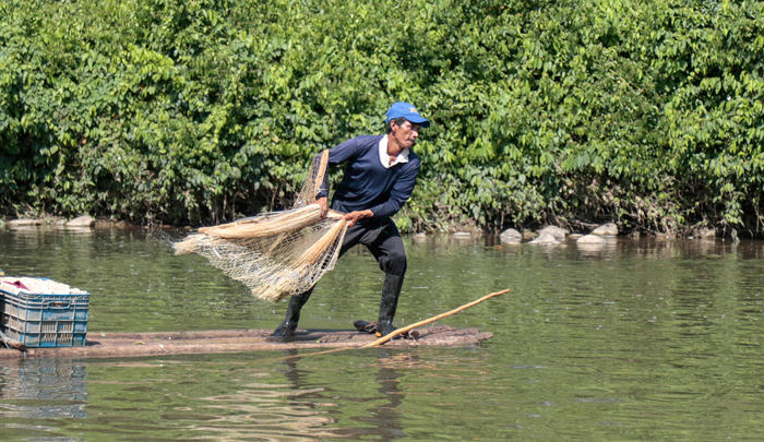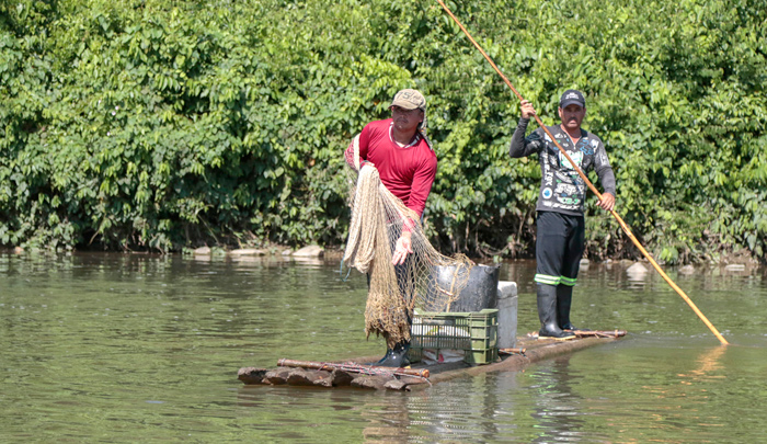 Los pescadores están siempre alerta, pero tranquilos. En cada balsa van equipos de dos, uno lanza la atarraya y el otro, con una vara de madera que hace las veces de remo, dirige el camino.