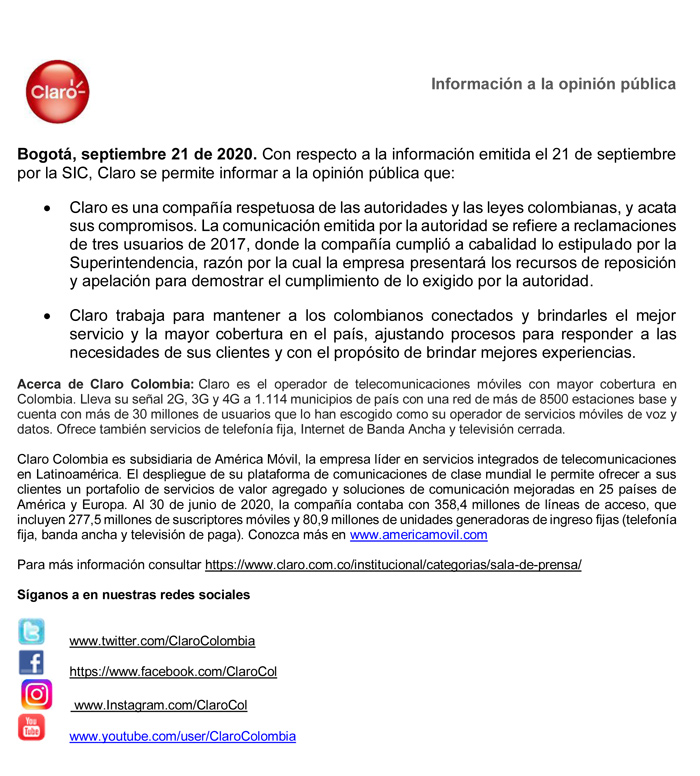Claro emitió una respuesta  sobre la actuaciñon de la Superintendencia de Industria y Comercio:
