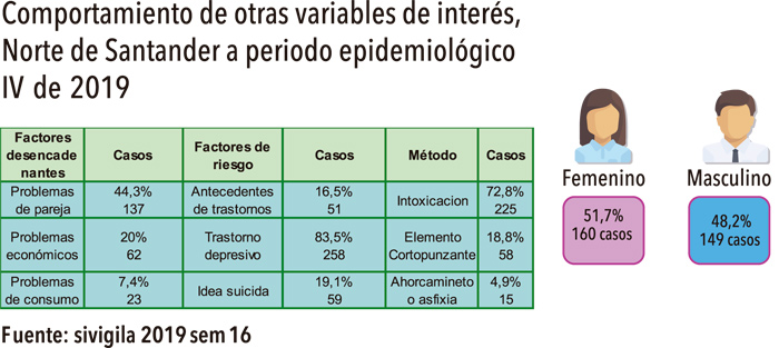 En Norte de Santander, a 13 de junio de este año, se reportaron 46 víctimas de suicidio. Pero vale la pena detallar que a cierre del primer trimestre de 2019 (las cifras del segundo semestre están por consolidarse). 13 personas: 10 hombres y 3 mujeres, tomaron la fatídica decisión de acabar con su existencia y según las estadísticas del Instituto Nacional de Medicina Legal, 5 de ellos fueron jóvenes (hombres y mujeres) entre los 14 y 24 años. Antioquia, Cundinamarca, Bogotá y Santander encabezan la lista.
