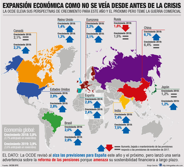 “El aumento de los salarios es aún más lento que antes de la crisis financiera. A finales de 2017, el aumento nominal de los salarios en la zona de la Ocde fue de solo la mitad que el registrado 10 años antes: en el segundo trimestre de 2007, cuando el promedio de tasas de desempleo de los países de la Ocde era casi el mismo de ahora. El aumento nominal de los salarios promedio era de 5,8% en comparación con el 3,2% del cuarto trimestre de 2017”, señala el informe.