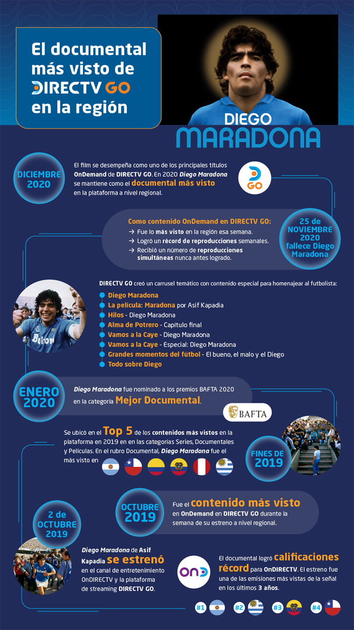 En noviembre de 2020 Diego Maradona se posicionó en el Top 3 de los contenidos más vistos de la plataforma a nivel regional, junto a series como ‘Game of Thrones’ y ‘This Is Us’. Actualmente el film continúa desempeñándose como uno de los principales títulos OnDemand de DIRECTV GO. En 2020 ‘Diego Maradona’ se mantiene como el documental más elegido por los usuarios en la región.