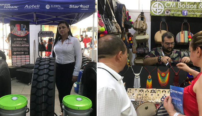 Yaneth Herrera de Procar llegó con sus enormes llantas y todos los productos para lubricar los camiones a la feria empresarial Expo de Todo. La marca CM atrajo a la clientela con sus exclusivos bolsos de cuero con bordados y artesanías.