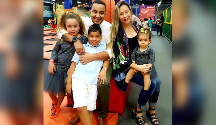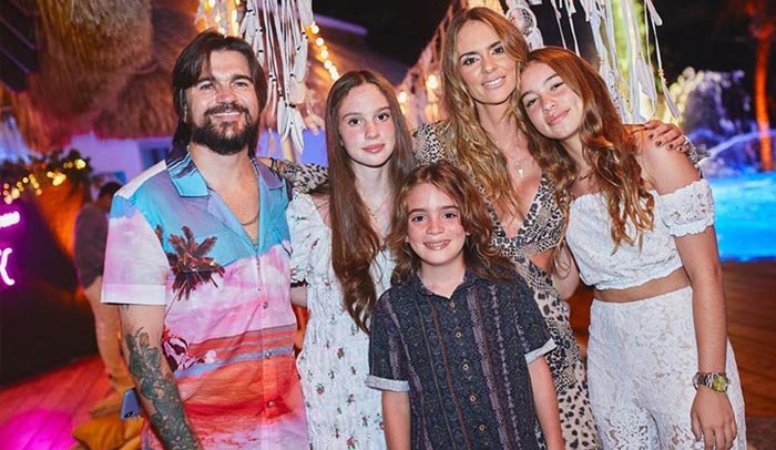 -Juanes aparece acompañado de su esposa la modelo y actriz Karen Martínez, con quien contrajo matrimonio en el 2002, y sus tres hijos: Luna, Paloma y Dante. Hace quince años la pareja colombiana trajo al mundo a Luna, su primera hija. Luego nacieron Paloma, 14 años, y el menor, Dante de 9 años, quien hasta ahora ha demostrado que tiene talento para cantar. ¿Le seguirá los pasos a su padre?.