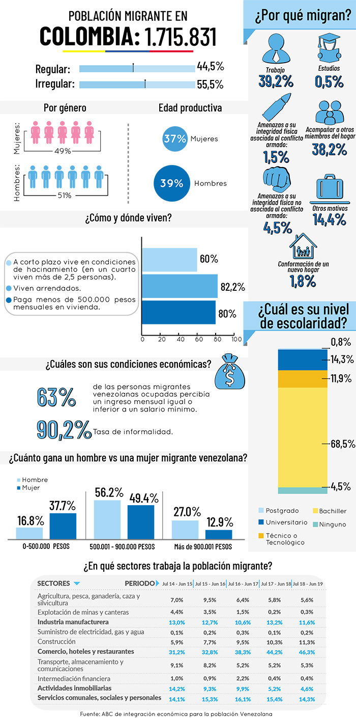 La búsqueda de oportunidades económicas en Colombia y el acompañamiento de otros miembros del hogar fueron los principales motivos para migrar de muchos de los venezolanos que se encuentran en el país. Según estudios, de estos migrantes, el 78 por ciento no tiene la intención de retornar a Venezuela y esto hace necesario la creación de una ruta que genere una integración económica.