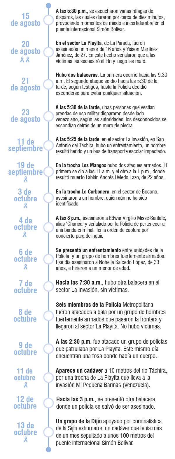 Dos años después, justamente en agosto y en ese mismo punto de la frontera entre Norte de Santander y el Táchira, empezaron a presentarse balaceras aleatorias, a plena luz del día, que a la fecha dejan 5 muertos y 3 heridos.