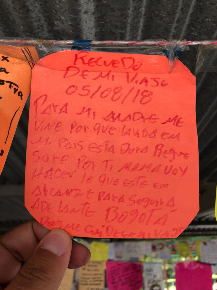 “Madre, me vine porque la vida en mi país está dura. Regresaré por ti mamá, voy a hacer lo que está a mi alcance para salir adelante”, reza una de las notas allí expuestas. Su autor no quiso firmarla el pasado 5 de agosto cuando pasó por donde Marta con destino Bogotá, pero ella, con solo verla, sabe de quién se trata.