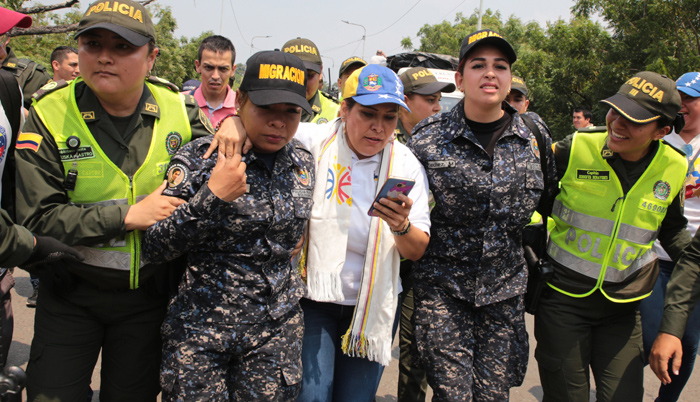 Al cruzar casi la totalidad del puente Francisco de Paula Santander fueron bloqueadas por la Guardia Nacional Bolivariana (GNB) y la Policía Militar Venezolana, que dispararon perdigones, gases lacrimógenos y granadas aturdidoras.