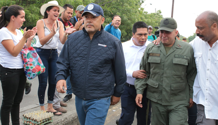 Dos oficiales de la Policía militar venezolana desertaron antes de ingresar las tractomulas, en medio de los aplausos de sus compatriotas.