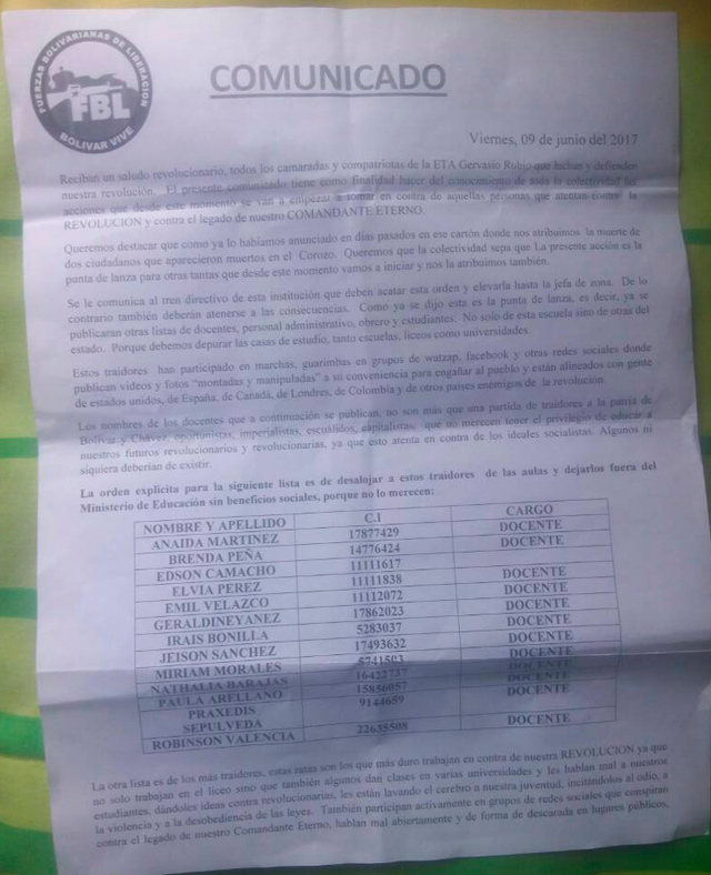 “Son en total catorce docentes los que han sido amenazados por la guerrilla, por participar en las manifestaciones realizadas por la oposición, según rezan los panfletos que fueron distribuidos en el centro de Rubio”, precisó Javier Tarazona, presidente del Colegio de Profesores del estado Táchira.
